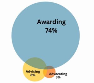 The Foundation has defined three linked strategies to which its resources are directed: awarding grants and loans (74%), advising students and families (8%) and advocating for policy change (3%). Going forward, we will: